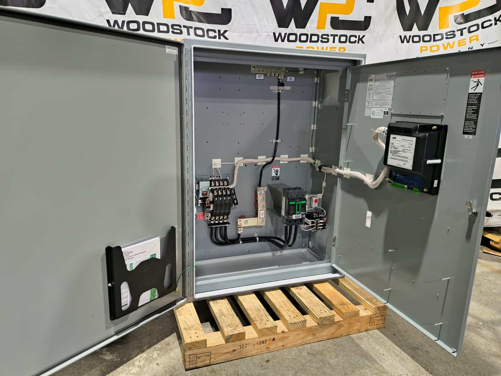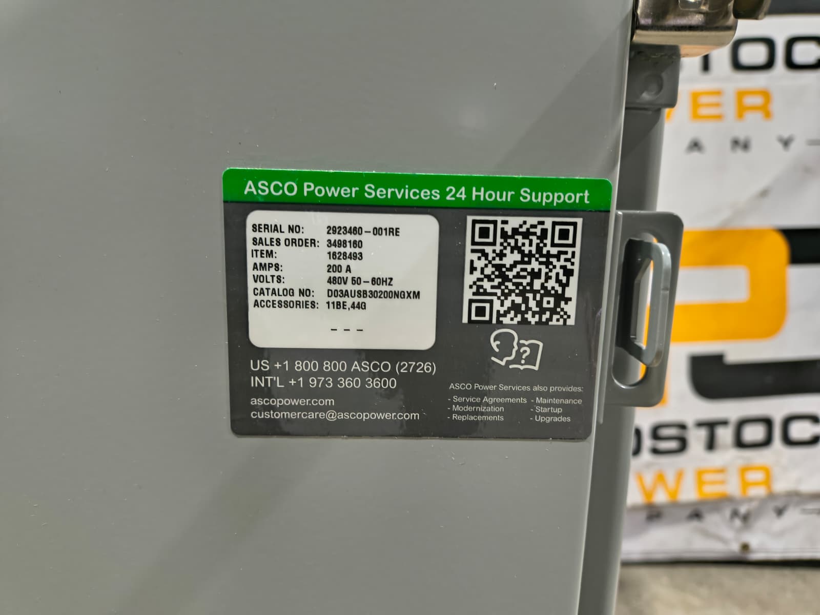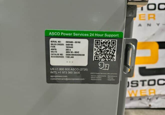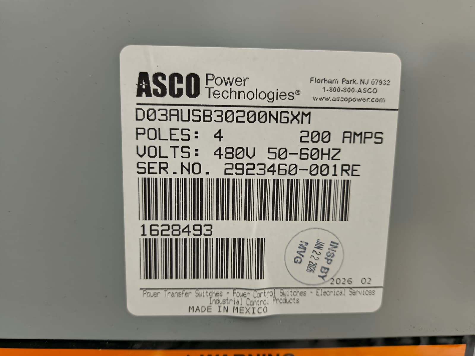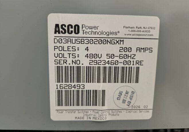 New 200 Amp ASCO Series 300 D03AUSB30200NGXM Automatic Transfer Switch 200 amp automatic transfer switch Service Entrance Rated NEMA 3R 480V 4-Pole 3-Phase 4-Wire Switched [B] neutral configuration Optional accessories: 11BE – Adds the following features to the Group G controller: (1) Serial RS-485 Modbus Communications (2) Multi-Schedule Engine Exerciser (3) a 300 Entry Event Log and (4) a common alarm output function. When applied on 3-Phase systems it also enables: (1) 3-Phase Emergency Source VLL sensing (2) Phase Rotation Monitoring (3) Emergency Source VLL Unbalance Monitoring 44G – Strip heater w/ thermostat, wired to load terminals: 208-600 volts Designed for wall-mounted ATS installation |
