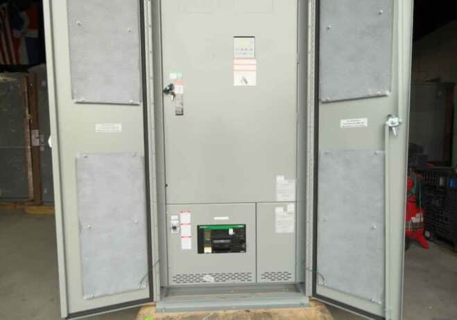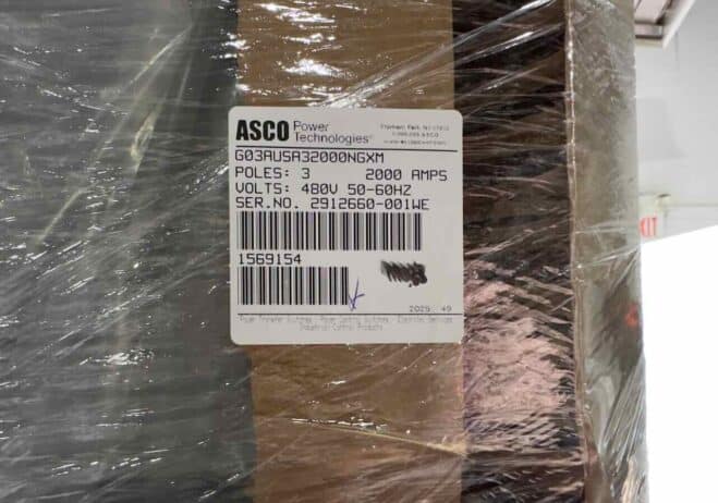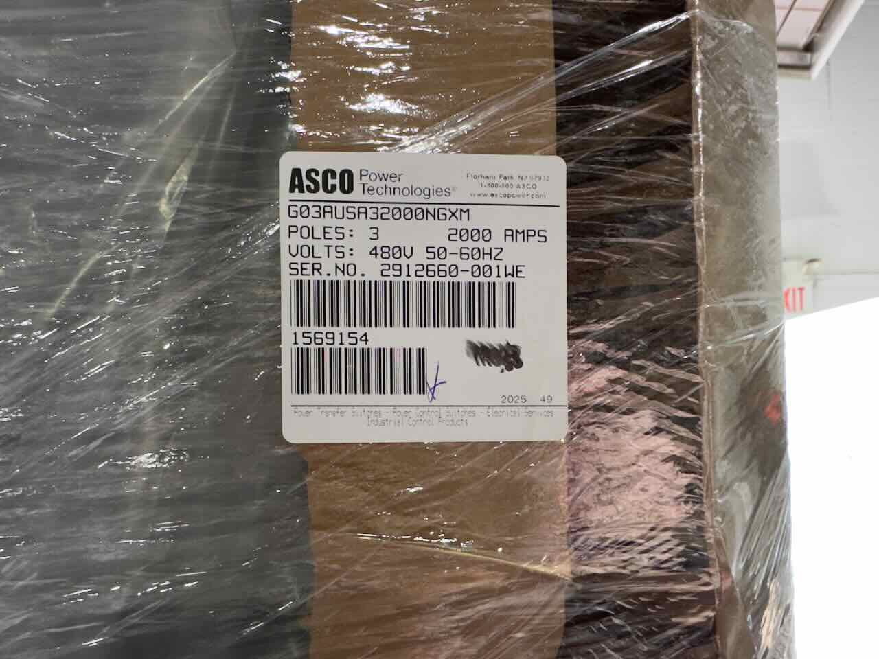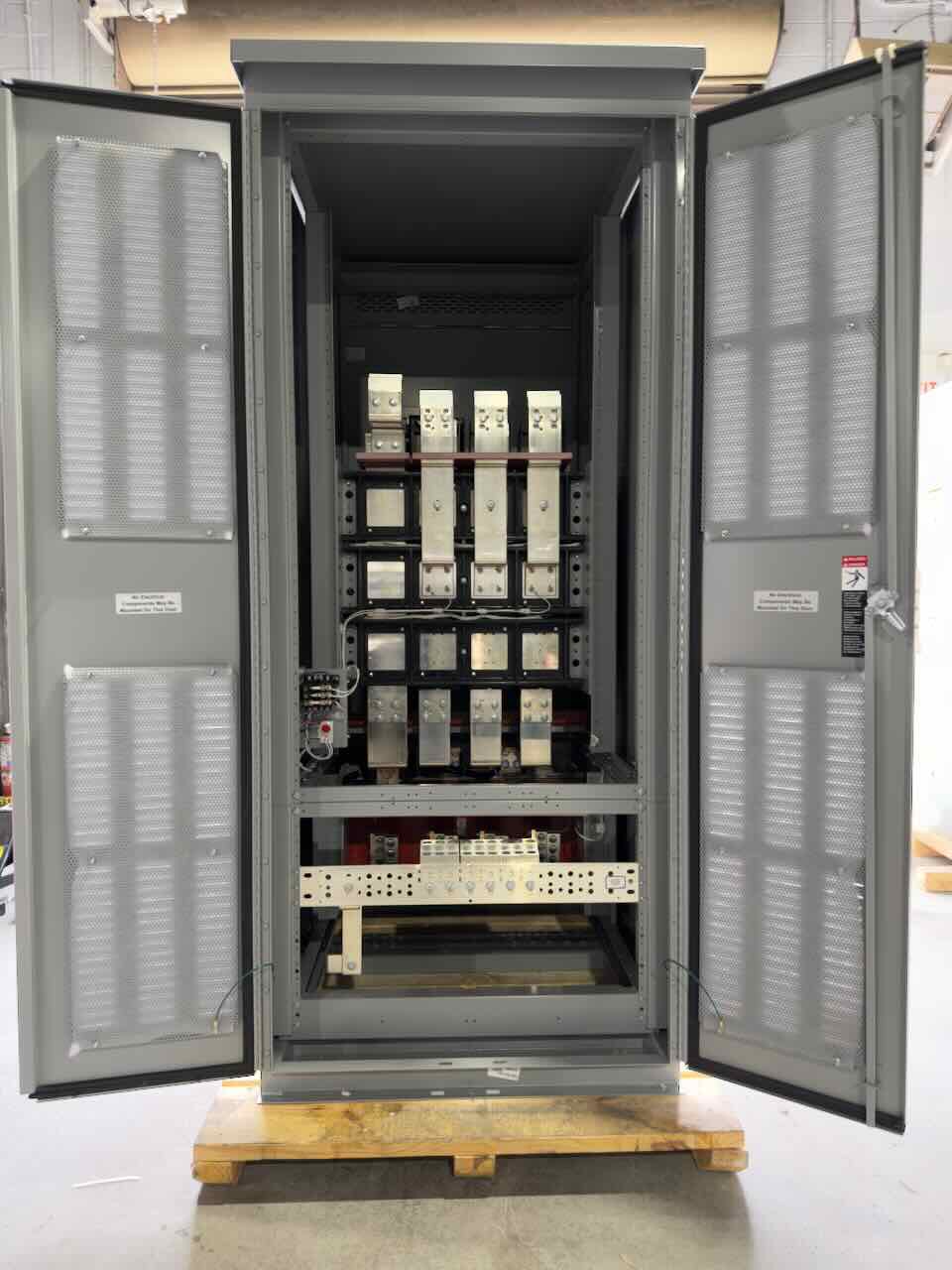 New 2000 Amp ASCO Series 300 G03AUSA32000NGXM Service Entrance Rated Automatic Transfer Switch 2000 amp automatic transfer switch NEMA 3R 480V 3-Pole 3-Phase 4-Wire Solid [A] neutral configuration Optional accessories: 11BE – Adds the following features to the Group G controller: (1) Serial RS-485 Modbus Communications (2) Multi-Schedule Engine Exerciser (3) a 300 Entry Event Log and (4) a common alarm output function. When applied on 3-Phase systems it also enables: (1) 3-Phase Emergency Source VLL sensing (2) Phase Rotation Monitoring (3) Emergency Source VLL Unbalance Monitoring 44G – Strip heater w/ thermostat, wired to load terminals: 208-600 volts 1191M1 – Internally powered Energy Reducing Maintenance Switch (ERMS) ERMS lowers the instantaneous pickup setting, utilizes a faster acting instantaneous trip function, or activates an alternate set of trip settings on a breaker to provide reduced arc flash incident energy. To be used on service entrance rated switches containing Square D breakers with MicroLogic 5.0/6.0 P/H trip units Customer is responsible for all trip unit settings. |