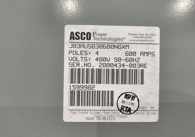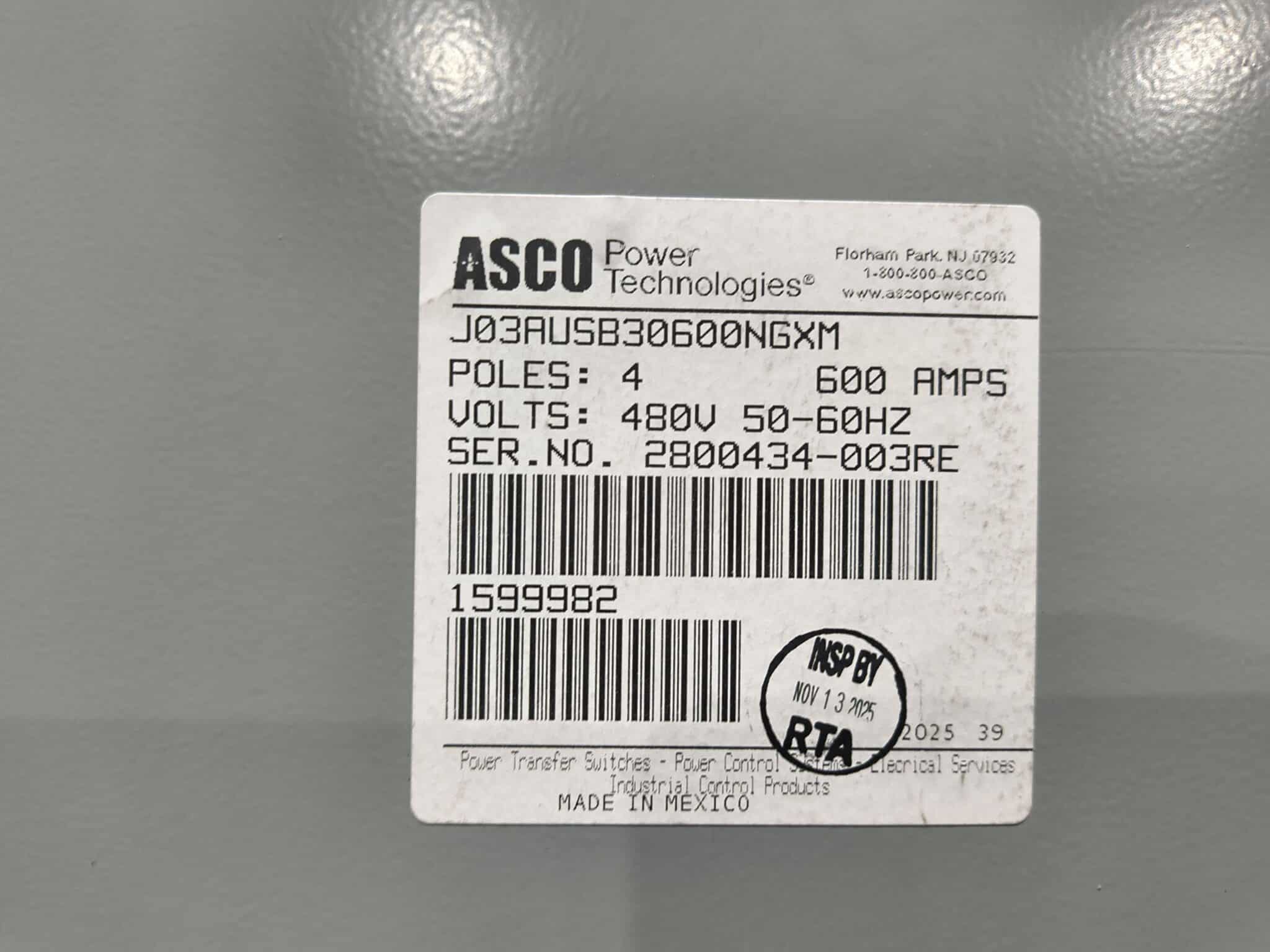 New 600 Amp ASCO J03AUSB30600NGXM Automatic Transfer Switch