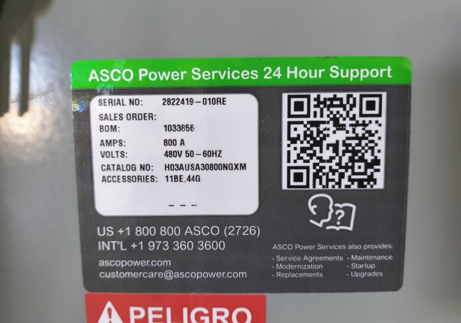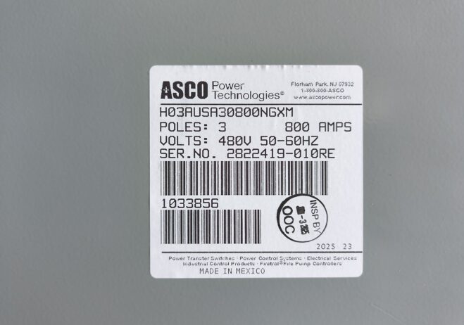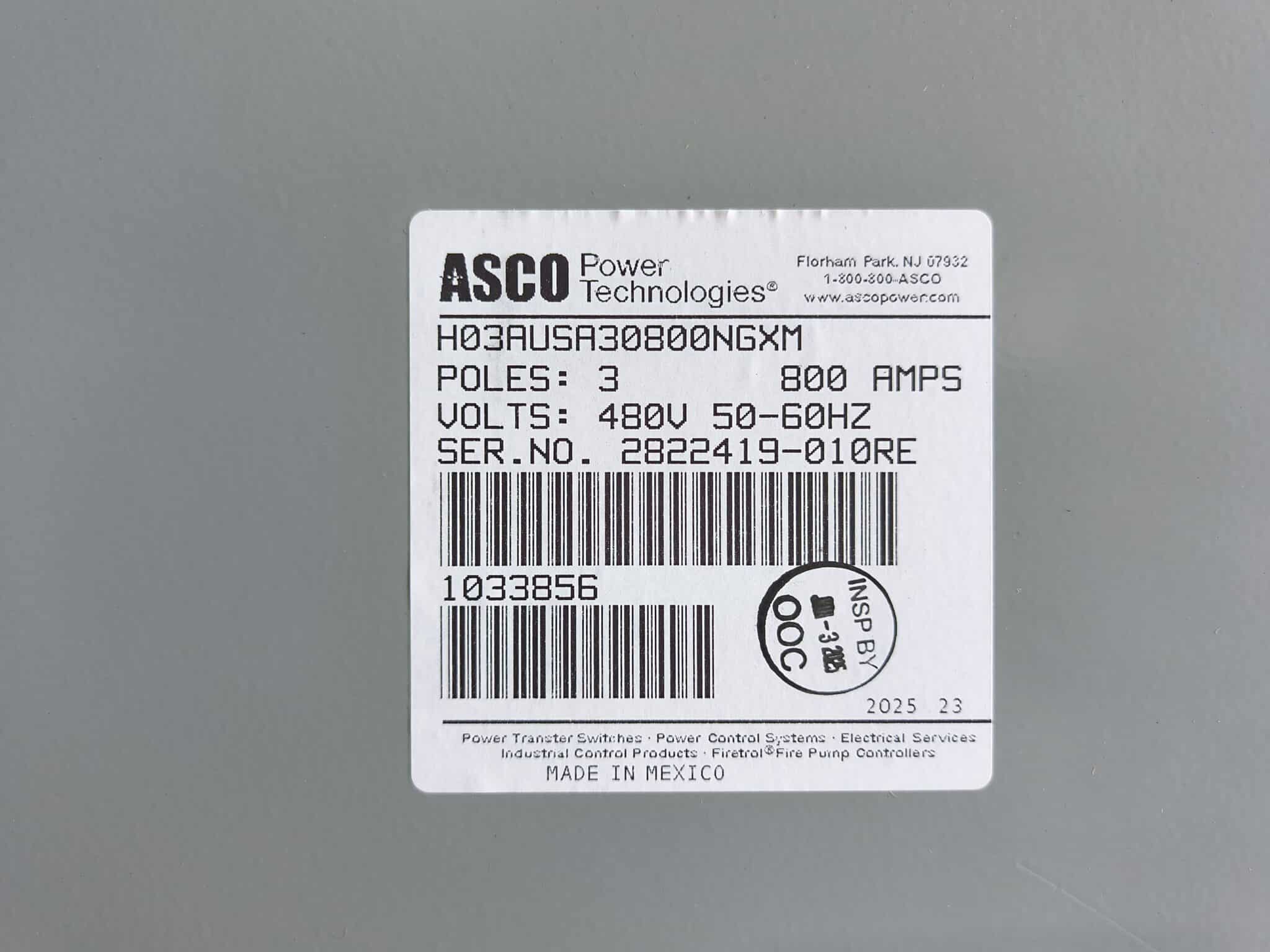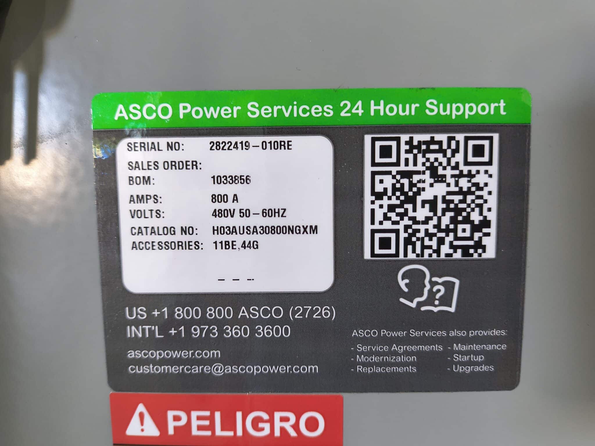 New 800 Amp ASCO H03AUSA30800NGXM Automatic Transfer Switch 800 amp automatic transfer switch Service entrance rated 3-Pole 4-Wire 3-Phase Solid [A] neutral configuration 800A 80% rated type MJL molded case breaker |