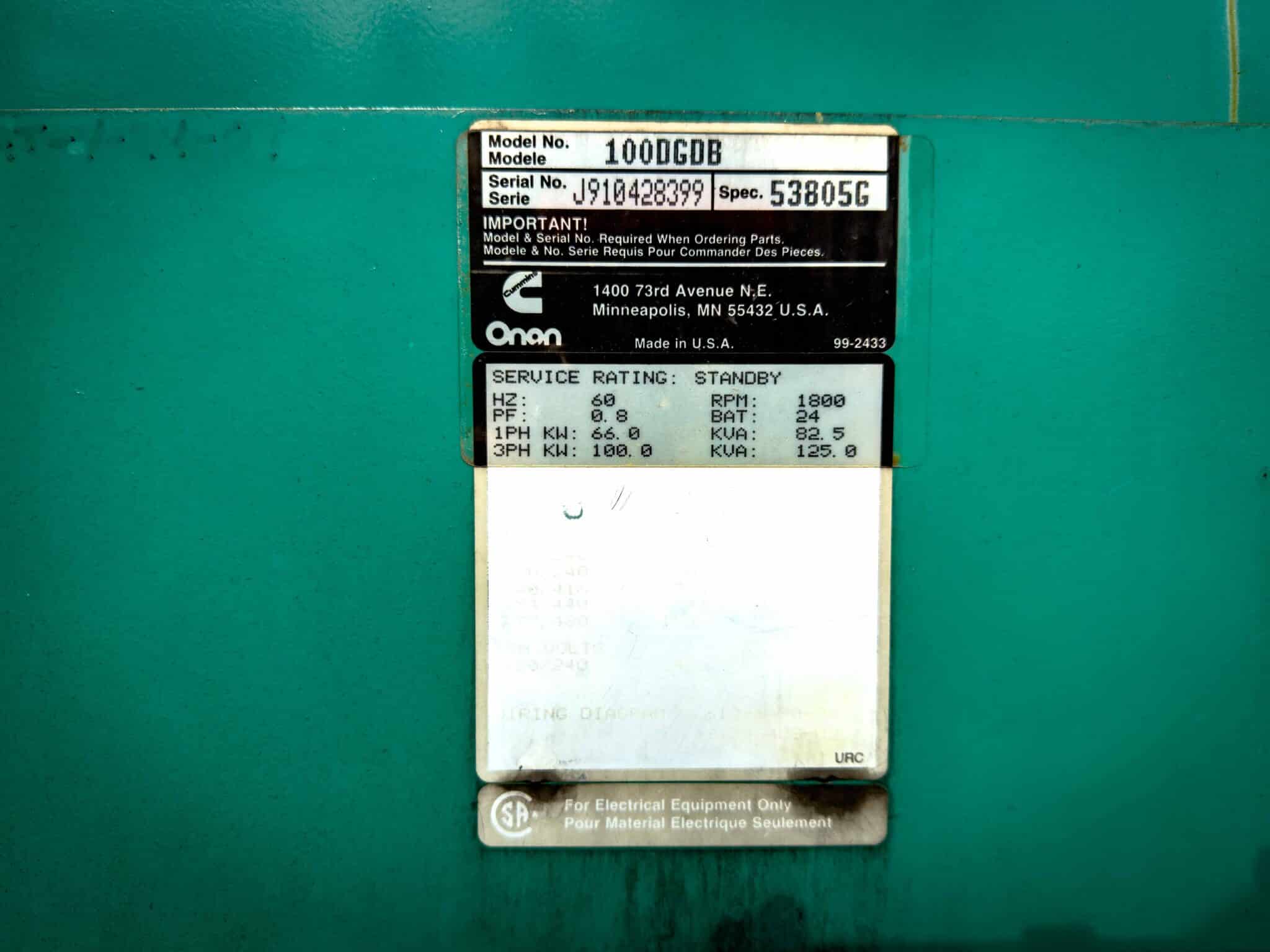 | Generator Model # | 100DGDB |