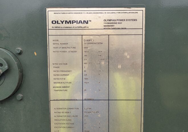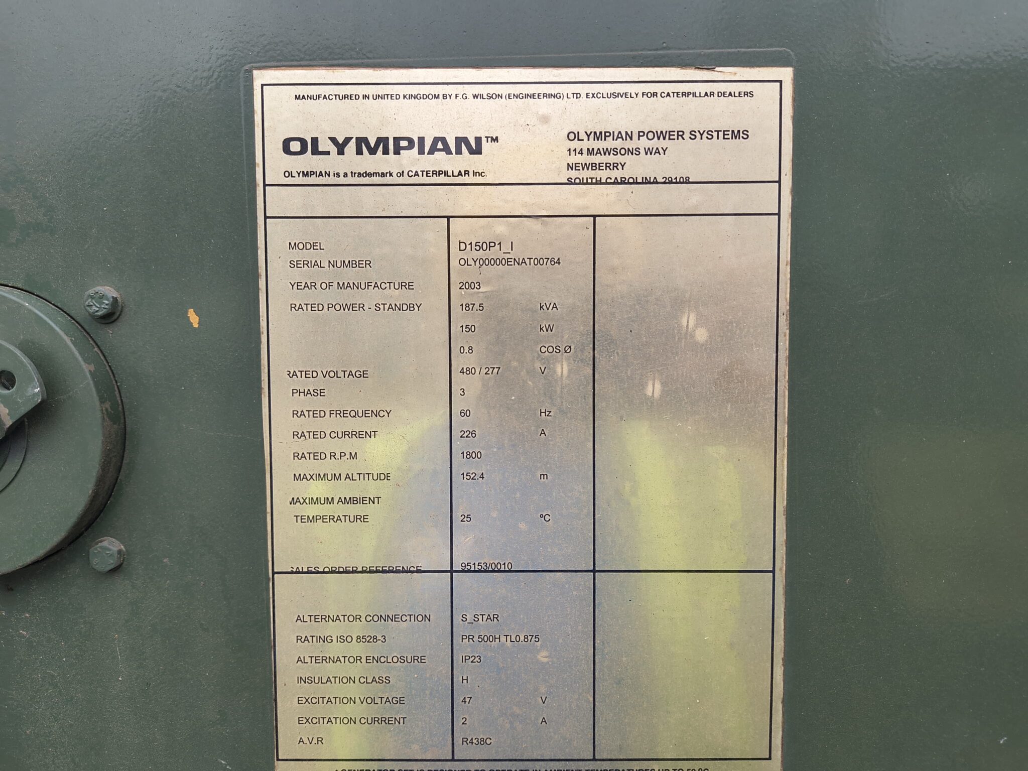 Used 150 kW Olympian D150P1_I Diesel Generator Sound-attenuated enclosure |
